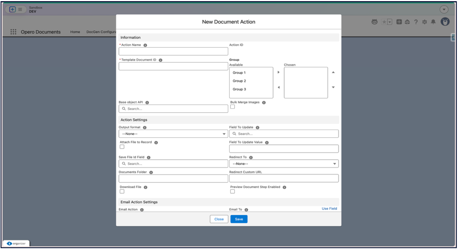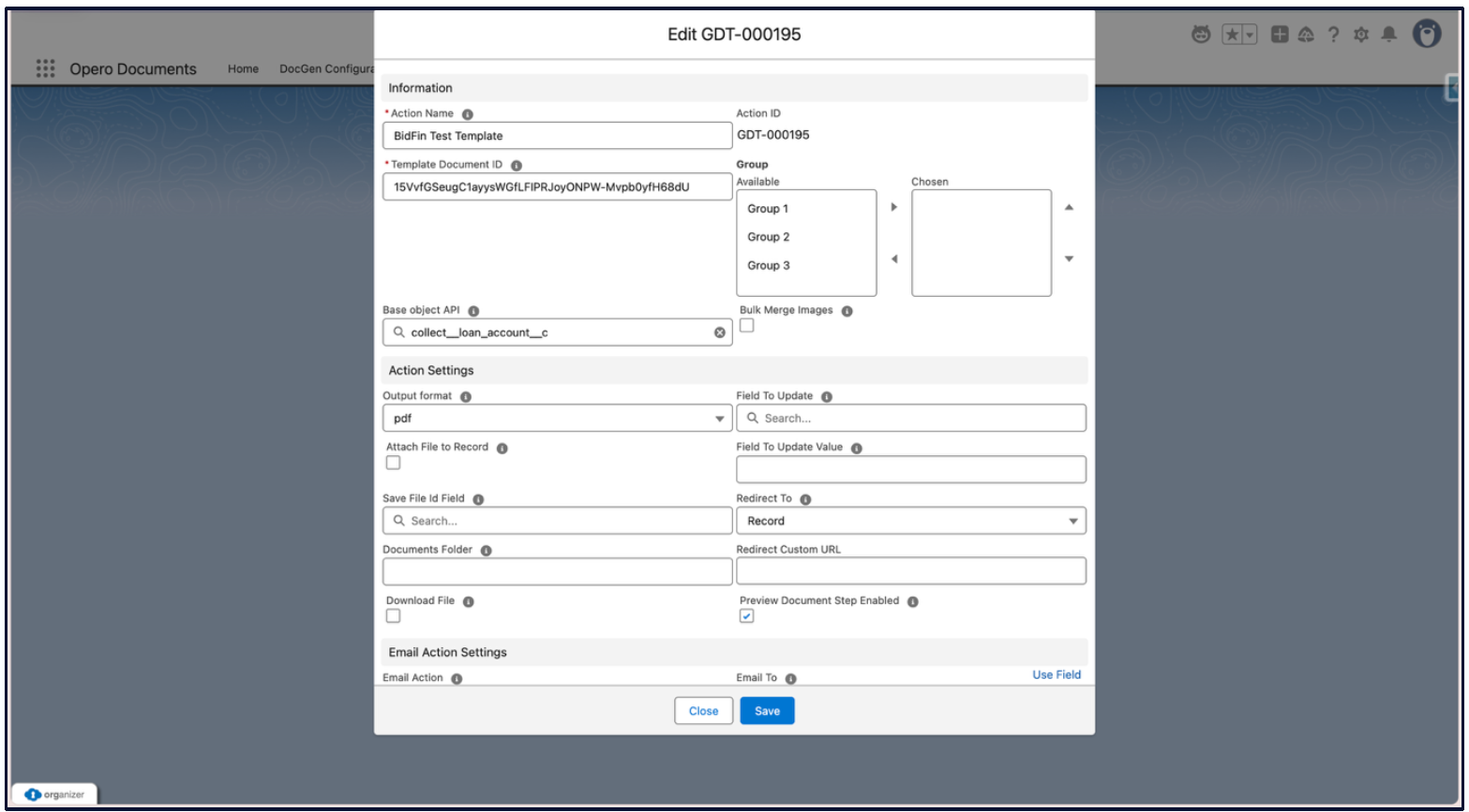- Fill all the mandatory fields such as 'Action Name' and 'Template Document ID'